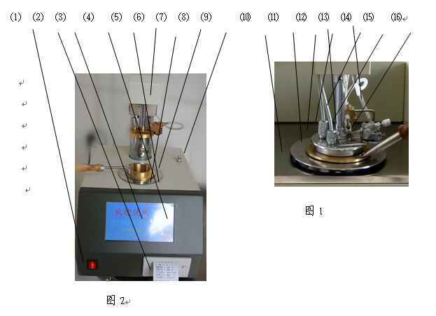 1、電源開關(guān);2、打印機;3、液晶顯示屏;4、操作鍵盤;5、加熱試驗裝置(見序號10~16);6、升降臂;7、試樣油杯;8、杯座;9、火焰調(diào)節(jié)旋鈕;10、加熱浴套;11、杯蓋;12、溫度傳感器;13、閃點檢測傳感器;14、攪拌軸;15引火口;16點火器。