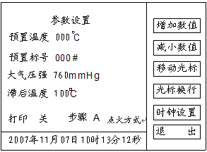 ⑶ 預(yù)置試驗溫度,試驗滯后溫度,打印機狀態(tài)。
