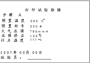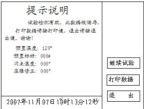 (9)溫度達到閃點值自動檢測閃點值,液晶屏鎖住當(dāng)前溫度值、試驗時間,大臂自動上升,數(shù)據(jù)被存儲,實驗失敗數(shù)據(jù)不被存儲,打印試驗數(shù)據(jù),自動關(guān)閉氣源閥門,測試工作完成。儀器同時風(fēng)冷,當(dāng)儀器冷卻達到低于預(yù)置溫度60℃時,方可進行下一杯試驗。試驗結(jié)束界面見圖11,打印數(shù)據(jù)見圖12。