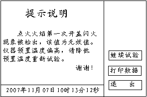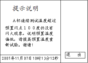 2、當(dāng)連續(xù)開蓋超過預(yù)置溫度加滯后溫度值時,仍沒有閃火現(xiàn)象,計算機自動判別終止試驗,試驗臂自動上升,數(shù)據(jù)不被存儲重新試驗,見圖14。