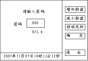 需要校準(zhǔn)儀器溫度時,在主界面按溫度校準(zhǔn)鍵進入圖18界面,該界面顯示密碼區(qū),在密碼區(qū)下面顯示當(dāng)前溫度值,按光標(biāo)提示輸入密碼(出廠時設(shè)定值)進入校準(zhǔn)界面。