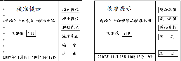 ⑴ 校準(zhǔn)傳感器溫度:將精密電阻箱按界面提示撥到0100歐,按確定鍵進入下一界面見圖19(不可按溫度修正鍵)。同樣方法按提示界面作第二校準(zhǔn)。